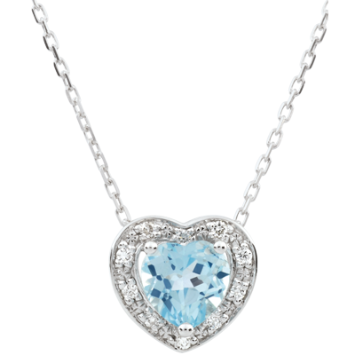 Un précieux coeur en or blanc et incrusté de diamants se fait l'écrin d'une somptueuse topaze bleue. Avec chaîne avec double position 42cm et 45cm en or 18 carats. 10 diamants : 0.06 carat - Or blanc (18 carats = 750/-): 2.1 g. Topaze bleue : 1 - Total: 0.97 carat Plus dimensions