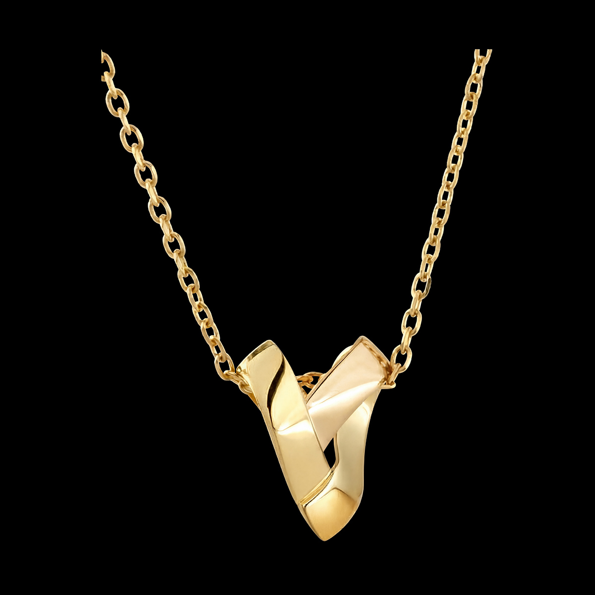 Tel un pliage de métal précieux, ce cœur naît en or jaune.Un pendentif cœur composé d’un ruban d’or délicatement plié et mobile sur une chaine fine.Le motif mesure environ 11mm de large et 12,5mm de haut.…