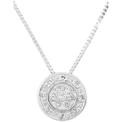 Deux cercles unis sont incrustés de diamants pour un classique à porter en toute occasion. Avec chaîne avec double position 42cm et 45cm en or 9 carats. 15 diamants : 0.06 carat - Or blanc (9 carats = 375/1000): 1.6 g. Cluster de diamants naturels : - Plus dimensions