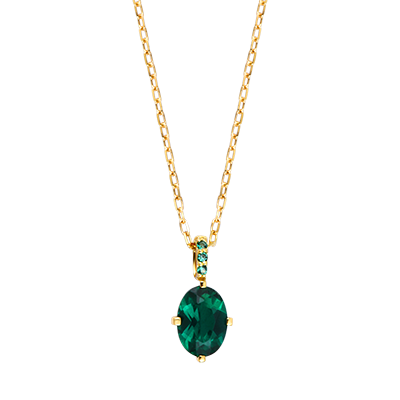 Une émeraude ovale de 1 carat mise en lumière par trois petites émeraudes sur la bélière.Un bijou éclatant aux reflets verts intenses, symbole de renouveau et d’élégance naturelle. Avec chaîne avec double position 42cm et 45cm en or 9 carats. Or jaune (9 carats = 375/1000): 1.5 g. Émeraude synthétique : 4 - Total: 1.03 carat Plus dimensions