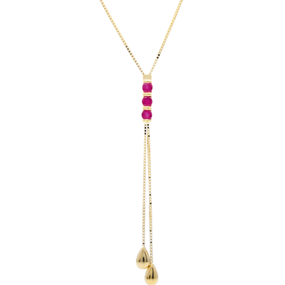 Deux gouttes d'or sont suspendues aux bras d'une trilogie de rubis. Maillons chaîne vénitienne. Avec chaîne avec double position 42cm et 45cm en or 9 carats. Or jaune (9 carats = 375/1000): 2.4 g. Rubis : 3 - Total: 0.48 carat Plus dimensions