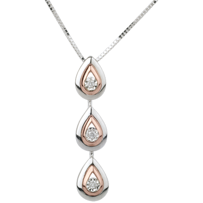 Trois délicates larmes en or blanc et or rose dont l'éclat est un diamant scintillant en leur centre. Longueur 25mm et largeur 5.5mm. Avec chaîne avec double position 42cm et 45cm en or 18 carats. 3 diamants : 0.03 carat - Or blanc et or rose (18 carats = 750/-): 2.8 g. Plus dimensions
