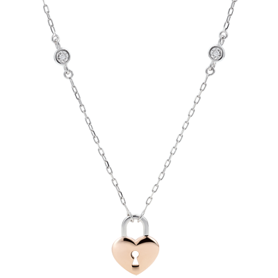 Un collier coeur en or rose porteur d'une serrure est monté sur une chaîne en or blanc habillée de deux brillants. Avec chaîne avec double position 42cm et 45cm en or 9 carats. 2 diamants : 0.01 carat - Or blanc et or rose (9 carats = 375/1000): 2.1 g. Plus dimensions