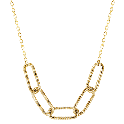 Cinq maillons or jaune finement torsadés se balancent sur une chaine délicate. Un collier moderne et féminin. Avec chaîne de longueur 45cm et anneau de réglage à 42cm. Avec chaîne avec double position 42cm et 45cm en or 18 carats. Or jaune (18 carats = 750/-): 1.7 g. Plus dimensions