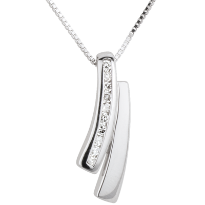 Une bande d'or blanc brillant et une bande d'or blanc pavé de diamants sont suspendues à une chaîne vénitienne en or blanc.