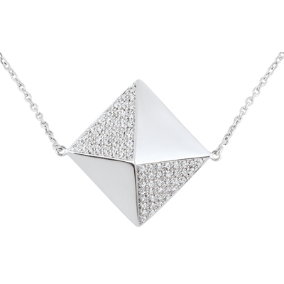 La forme d'octaèdre du diamant brut est déclinée en or et pavages de diamants pour rendre hommage à sa forme brute et originelle. Longueur: 90cm.