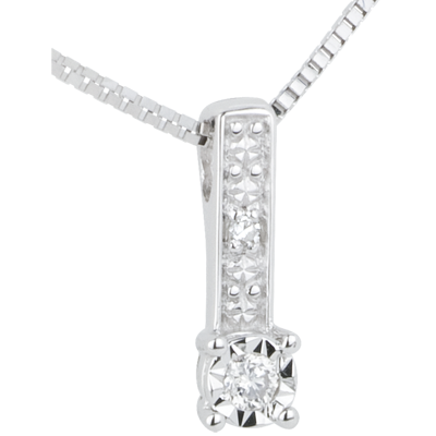 Un diamant solitaire est serti dans un écrin d'or blanc qui emplifie son effet de taille et la bélière est travaillée façon diamant et comporte un brillant. Avec chaîne avec double position 42cm et 45cm en or 9 carats. 2 diamants : 0.02 carat - Or blanc (9 carats = 375/1000): 1.6 g.Plus dimensions
