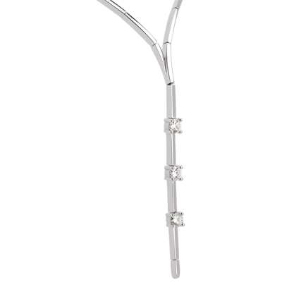 La délicatesse d'un tour de cou échancré, perlé par l'éclat d'une trilogie diamants. Avec chaîne avec double position 42cm et 45cm en or 18 carats. 3 diamants : 0.47 carat - Or blanc (18 carats = 750/-): 17.1 g. Plus dimensions