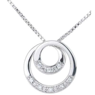 Un tourbillon d'or blanc incrusté de diamant s'enroule à l'infini sur une chaîne en or blanc,
