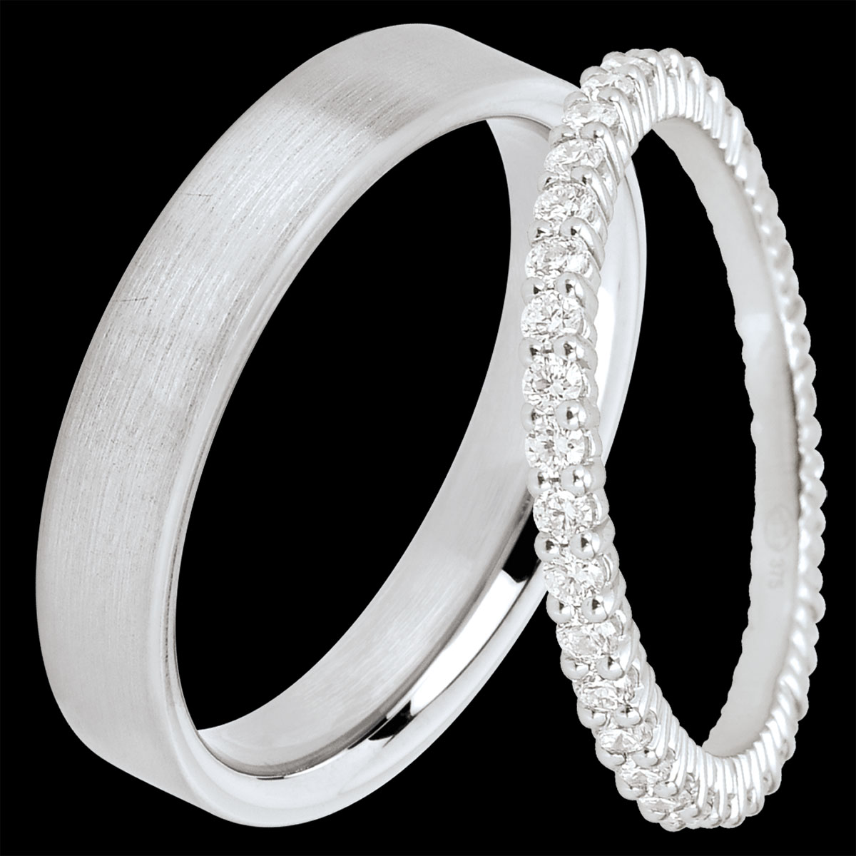 Une élégante paire d'alliances pour elle & lui. Un anneau tour complet serti griffe composé 38 diamants de 0.57 carat pour madame, un anneau ruban finition toilée en or blanc de 4mm de largeur pour monsieur.
