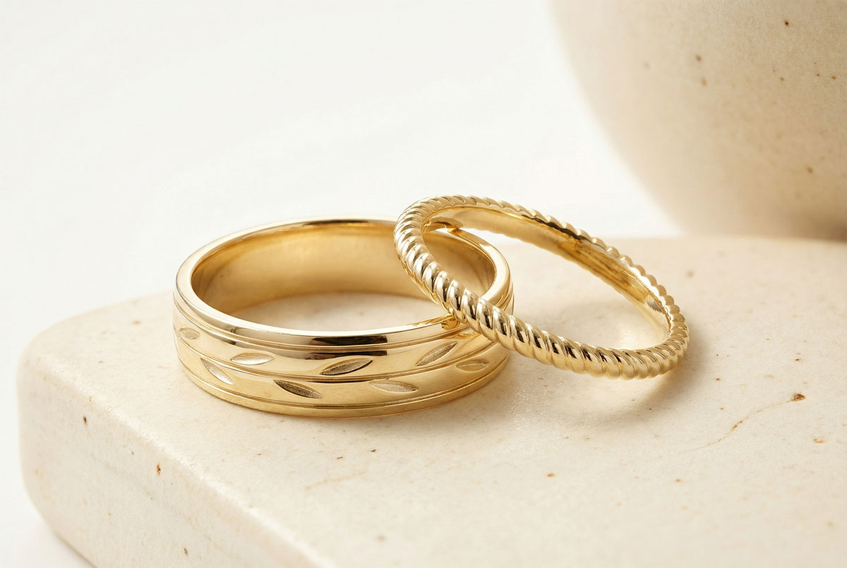 Un anneau en cordage d'or pour accompagner la bague de fiançailles assortie, un cordage d'une autre couleur d'or ou d'autres anneaux à motifs.