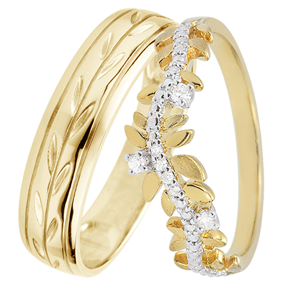 Une élégante paire d'alliances pour elle & lui. Un feuillage d'or jaune serti de 7 diamants pour madame, une large alliance d'or jaune gravée d'un feuillage éternel pour monsieur. Or jaune (9 carats = 375/1000): 0 g. Plus dimensions