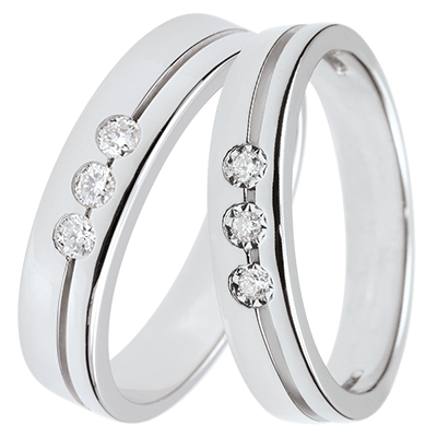 Une élégante paire d'alliances d'or blanc sertie d'une trilogie de diamants. Or blanc (18 carats = 750/-): 0 g.Plus dimensions