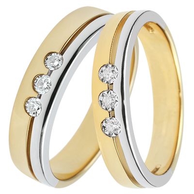 Une élégante paire d'alliances d'or jaune et blanc sertie d'une trilogie de diamants. Or blanc et or jaune (18 carats = 750/-): 0 g.Plus dimensions