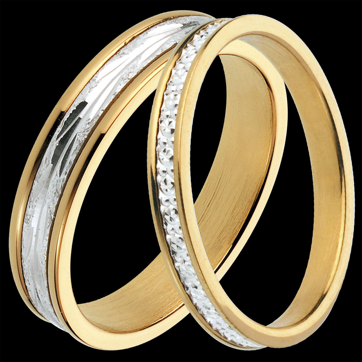 Une élégante paire d'alliances pour elle & lui. Un anneau d'or blanc finement travaillé est couronné d'or jaune madame, un anneau or jaune souligné d'un arceau or blanc gravé de feuillages pour monsieur. Or blanc et or jaune (18 carats = 750/-): 0 g.Plus dimensions