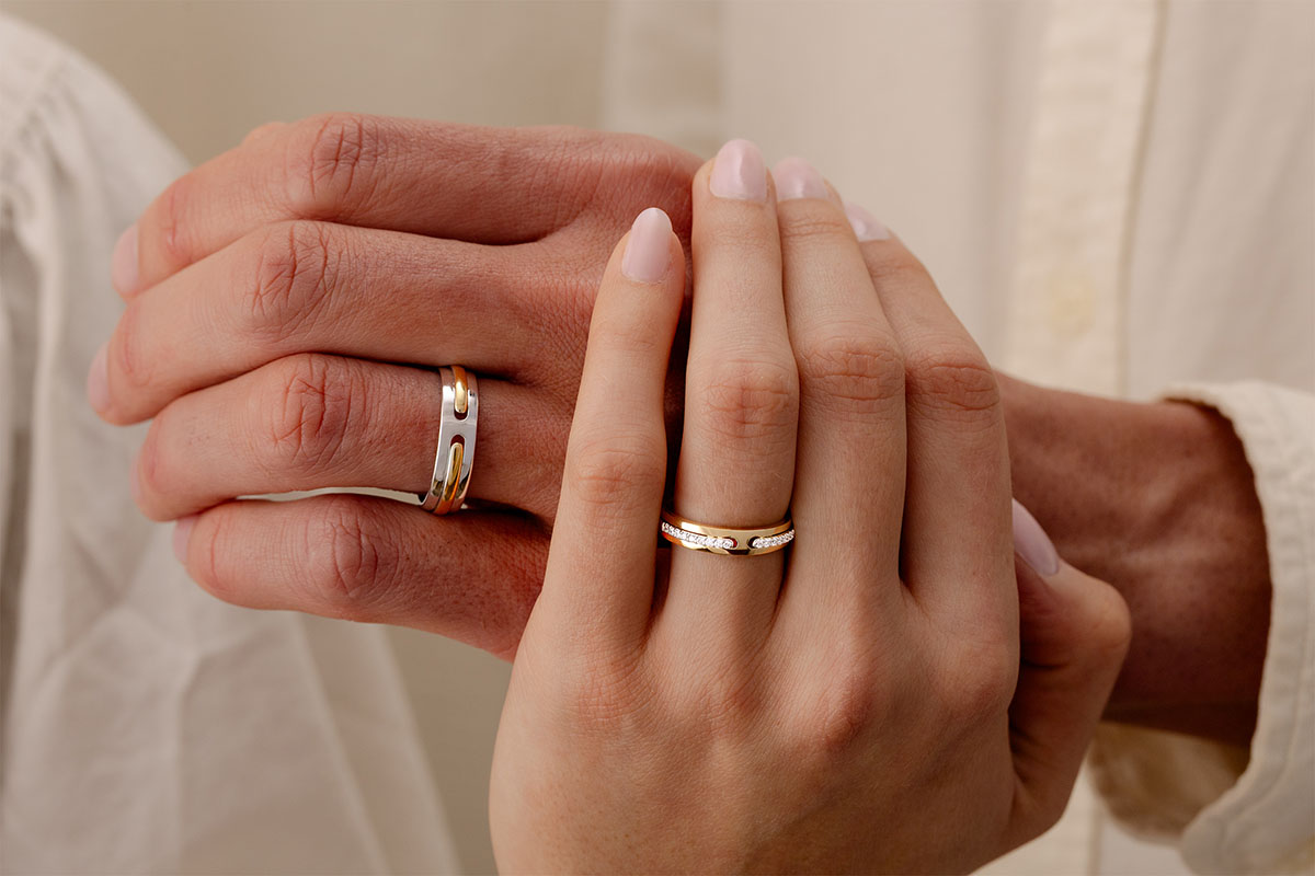 Une élégante paire d'alliances pour elle & lui. Deux lignes de diamants sont unies comme une promesse d'éternité dans un anneau d'or jaune pour madame, deux lignes d'or jaune sont unies comme une promesse d'éternité dans un anneau or blanc pour monsieur.