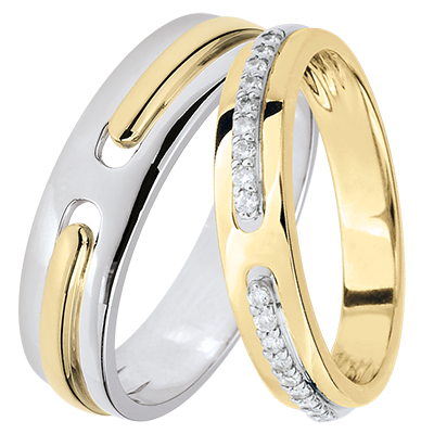 Une élégante paire d'alliances pour elle & lui. Deux lignes de diamants sont unies comme une promesse d'éternité dans un anneau d'or jaune pour madame, deux lignes d'or jaune sont unies comme une promesse d'éternité dans un anneau or blanc pour monsieur.