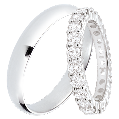 Une élégante paire d'alliances pour elle & lui. Un anneau tour complet serti griffe composé 29 diamants ronds de 1.11 carat pour madame, un jonc en or jaune poli de 4mm de largeur pour monsieur.