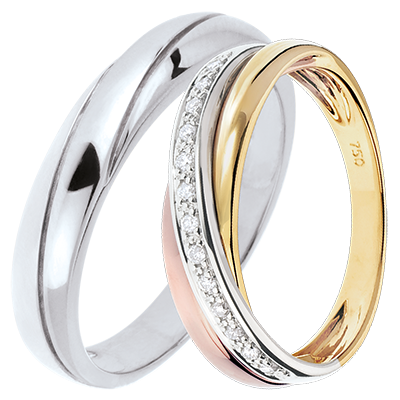 Une élégante paire d'alliances pour elle & lui. L'alliance équilibrée des trois ors soulignée d'un pavage diamants sur or blanc pour madame, un anneau or blanc sobre et élégant pour monsieur. Trois ors (18 carats = 750/-): 0 g. Plus dimensions