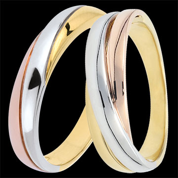 Une élégante paire d'alliances pour elle & lui. Une trilogie d'anneaux 3 ors enlacés pour madame, une version trois ors pour monsieur.