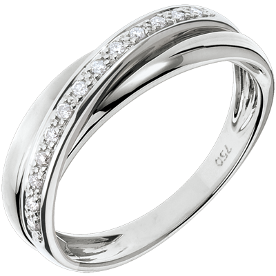 L'alliance équilibrée de 3 anneaux, soulignée d'un pavage diamants sur or blanc crée une bague exceptionnelle. Cette bague en or blanc et diamant est un bijou qui peut être une alliance de mariage ou un cadeau d'exception. 13 diamants : 0.1 carat - Or blanc (18 carats = 750/-): 3.9 g. Plus dimensions