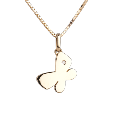 Un petit papillon en or jaune aux formes rondes et douces dont une aile est ornée d'un diamant. Grand modèle. Livré sans chaîne. 1 diamant : 0.05 carat - Or jaune (18 carats = 750/-): 0.9 g. Plus dimensions