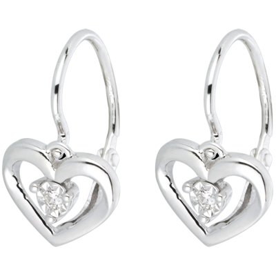 un diamant lové dans un petit coeur de finesse pour chacune de ses boucles d'oreilles en or blanc. Modèle dormeuses.