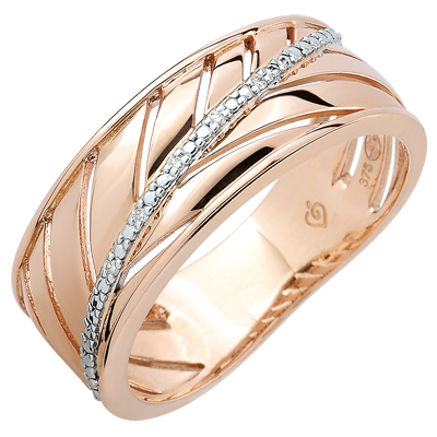 Une bague large en or rose toute en légèreté inspirée de la feuille de palme. Sa tige principale est ornée d'une rivière de diamants. Une bague à porter tous les jours ou pour les grandes occasions. 5 diamants : 0.02 carat - Or rose (9 carats = 375/1000): 3.3 g.Plus dimensions