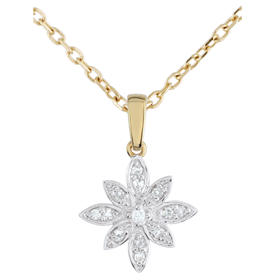 Une fleur en or blanc est incrustée de diamants comme autant d'éclats d'étoile. Classique, il se porte sur une chaîne en or jaune, pour plus de modernité, une chaîne en or blanc. Livré sans chaîne. 13 diamants : 0.09 carat - Or blanc et or jaune (9 carats = 375/1000): 0.5 g.Plus dimensions