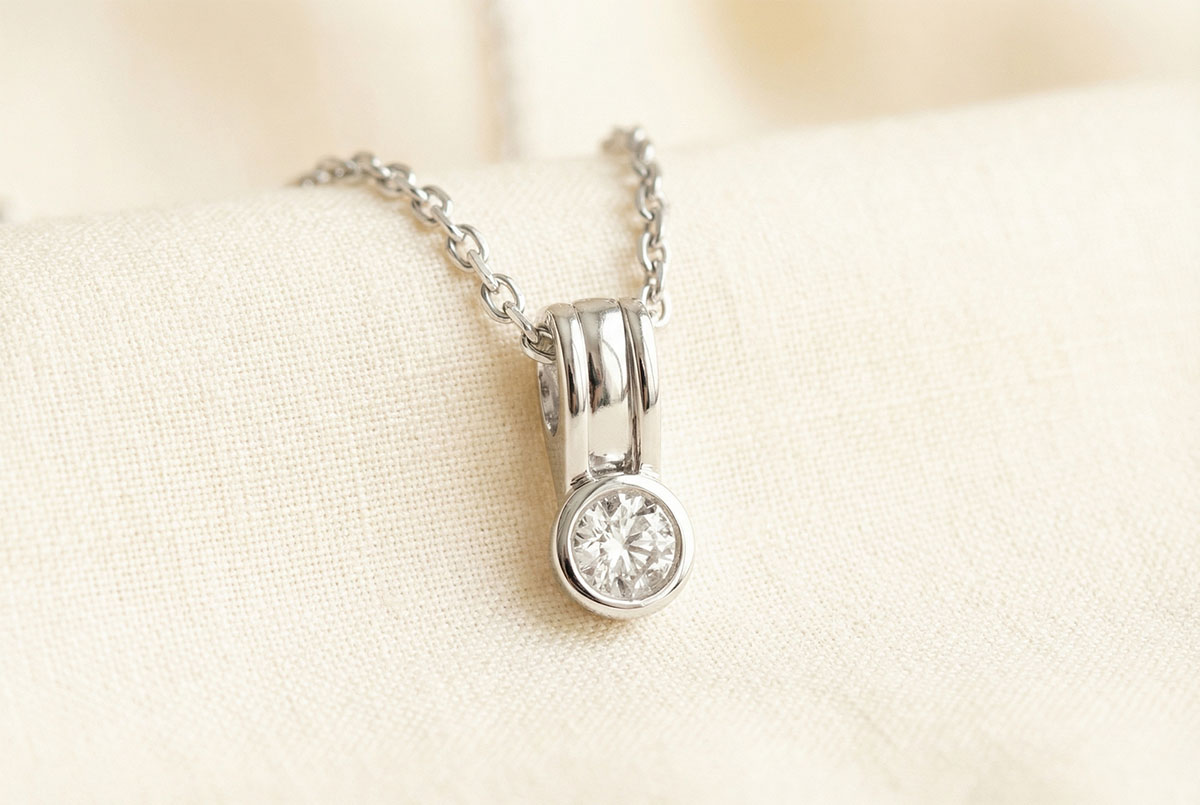 Un pendentif diamant sobre et fort d'attache, pour un éclat discret au creux du cou.