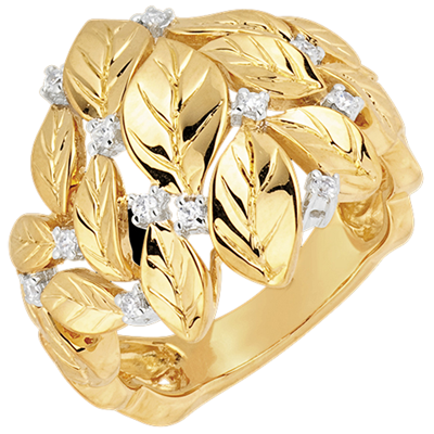 La délicate rosée capturée à l'aube de l'éden, sur son écrin de feuilles d'or, elle est l'éphémère joaillerie de la nature... Bague dessinée par Ruan Shanshan de l'école ESMOD. 11 diamants : 0.12 carat - Or jaune (18 carats = 750/-): 6.9 g. Plus dimensions