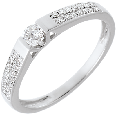 L'éclat absolu d'un diamant de centre sur une monture graphique et contemporaine soulignée d'un pavage adjacent. Diamant central: 0.12 carat. 29 diamants : 0.25 carat - Or blanc (18 carats = 750/-): 1.9 g.Plus dimensions