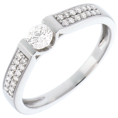 L'éclat absolu d'un diamant de centre sur une monture graphique et contemporaine soulignée d'un pavage adjacent. Diamant central: 0.24 carat. 29 diamants : 0.38 carat - Or blanc (18 carats = 750/-): 3.3 g. Plus dimensions