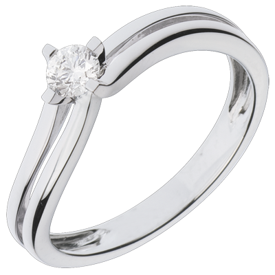 Un anneau en or blanc se divise pour porter à nu un solitaire éclatant.