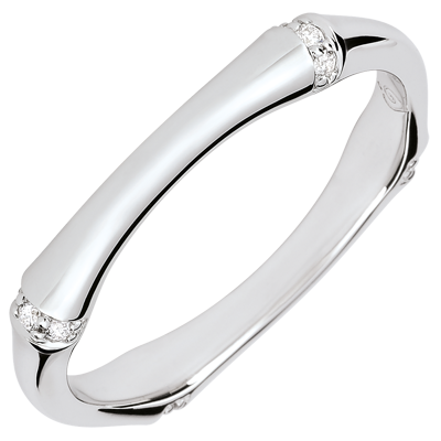 Une branche de bambou souple et solide se métamorphose en un anneau d'or blanc éternel, serti de diamants.