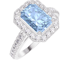Bague Or blanc 9 carats - Topaze bleue Rectangle 1 carat - Halo Diamant - Sertissage Diamant