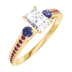 Bague Or jaune 9 carats - Diamant Rectangle 0.3 carat - Pierres de côté Saphir bleu - Sertissage Rubis