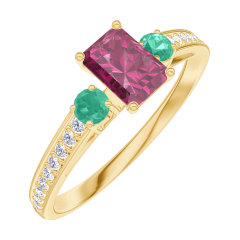 Bague Or jaune 18 carats - Rubis Rectangle 0.3 carat - Pierres de côté Émeraude - Sertissage Diamant