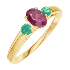 Pourquoi nous faire confiance ? « L'ATELIER » Nº 160982 Bague Or jaune 9 carats - Rubis Ovale 0.3 carat - Pierres de côté Émeraude