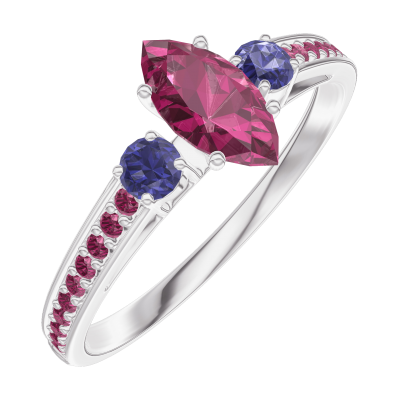 « L'ATELIER » Nº 161172Bague Or blanc 9 carats - Rubis Marquise 0.3 carat - Pierres de côté Saphir bleu - Sertissage Rubis
