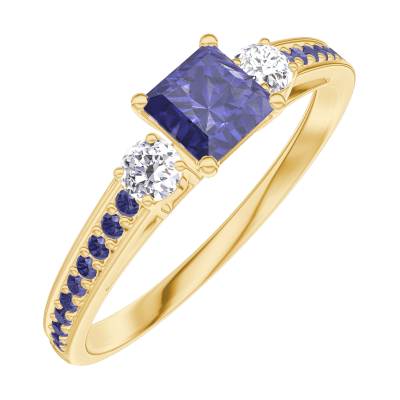 « L'ATELIER » Nº161334Bague Or jaune 9 carats - Saphir bleu Princesse 0.3 carat - Pierres de côté Diamant - Sertissage Saphir bleu