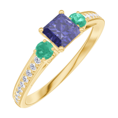 Bague Or jaune 9 carats - Saphir bleu Princesse 0.3 carat - Pierres de côté Émeraude - Sertissage Diamant