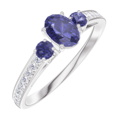 Bague Or blanc 9 carats - Saphir bleu Ovale 0.3 carat - Pierres de côté Saphir bleu - Sertissage Diamant