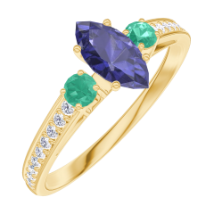 Pourquoi nous faire confiance ? « L'ATELIER » Nº 161785 Bague Or jaune 18 carats - Saphir bleu Marquise 0.3 carat - Pierres de côté Émeraude - Sertissage Diamant