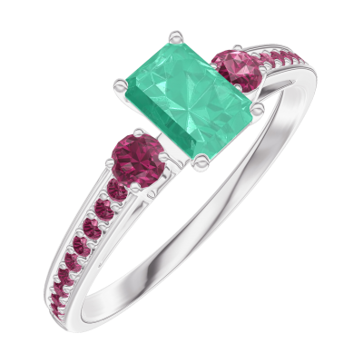 « L'ATELIER » Nº162052Bague Or blanc 9 carats - Émeraude Rectangle 0.3 carat - Pierres de côté Rubis - Sertissage Rubis