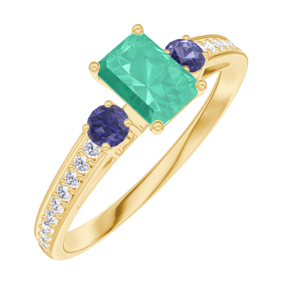 « L'ATELIER » Nº162066Bague Or jaune 9 carats - Émeraude Rectangle 0.3 carat - Pierres de côté Saphir bleu - Sertissage Diamant
