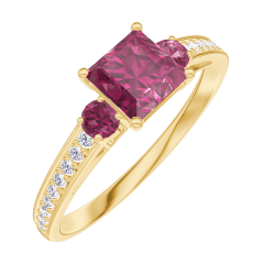 Pourquoi nous faire confiance ? « L'ATELIER » Nº 163146 Bague Or jaune 9 carats - Rubis Princesse 0.5 carat - Pierres de côté Rubis - Sertissage Diamant