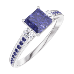 Bague Or blanc 9 carats - Saphir bleu Princesse 0.5 carat - Pierres de côté Diamant - Sertissage Saphir bleu
