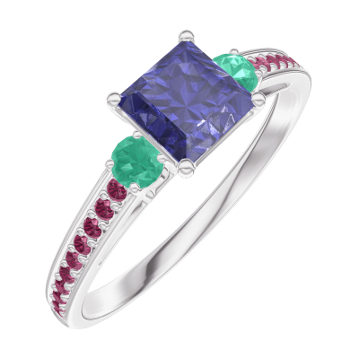 « L'ATELIER » Nº 163791Bague Or blanc 18 carats - Saphir bleu Princesse 0.5 carat - Pierres de côté Émeraude - Sertissage Rubis