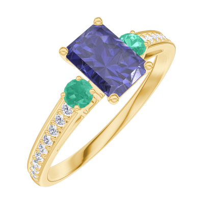 « L'ATELIER » Nº163885Bague Or jaune 18 carats - Saphir bleu Rectangle 0.5 carat - Pierres de côté Émeraude - Sertissage Diamant